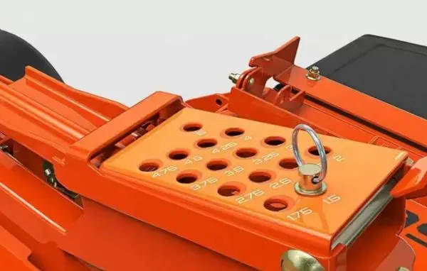 Raising the cutting deck is simple thanks to a foot-operated lifting system. The cutting height can be adjusted across 15 positions and is locked in place by a sturdy metal plug.