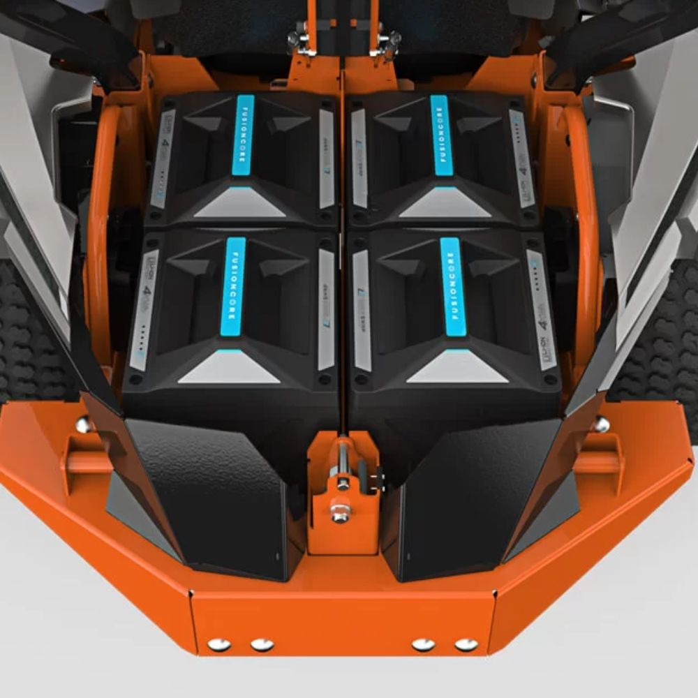 This mower features a 122 cm fully welded fabricated steel cutting deck, delivering professional cutting performance. The deep deck design improves airflow and cutting efficiency. This ensures clean and consistent cutting results. The deck includes three FusionCore direct-drive electric blade motors, delivering strong and reliable cutting power. The slip clutch system protects motors during impacts, improving durability. Forged aluminium spindle construction improves strength and reliability. The side discharge system ensures efficient grass distribution. An optional mulching kit provides additional flexibility.