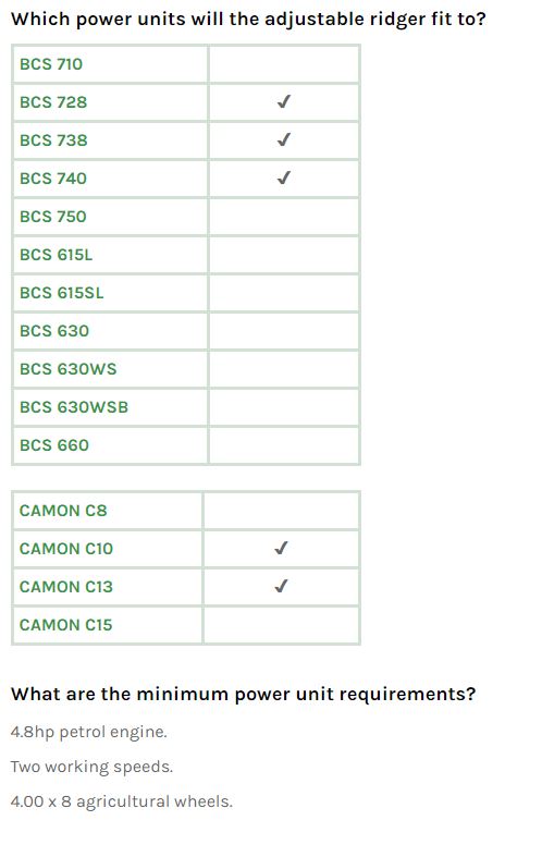 An adjustable ridger that is ideal for earthing up as well as creatnig ridges and furrows in cultivated ground, designed to fit the BCS 728, 738 and 740 power units.