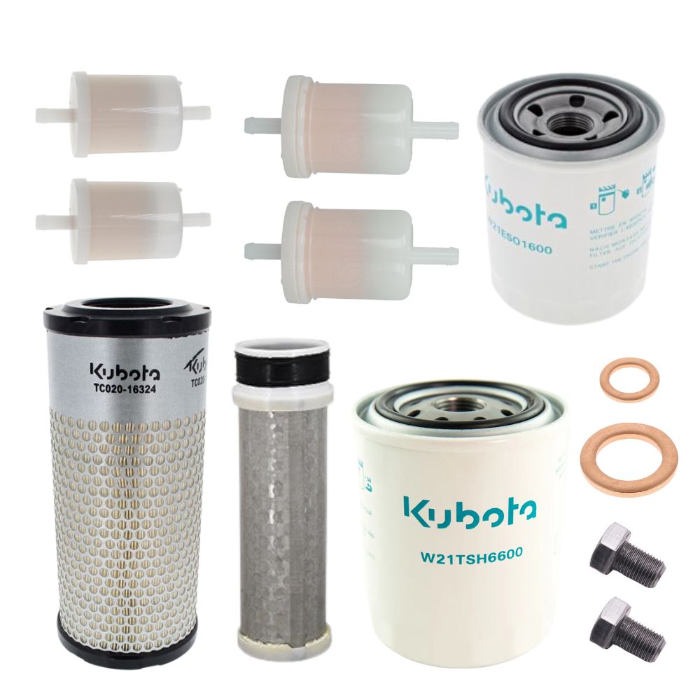 A genuine Kubota service kit for the Kubota ZD1211 tractor, comprised of high quaility filters and replacement parts. *parts may differ slightly in colour and design