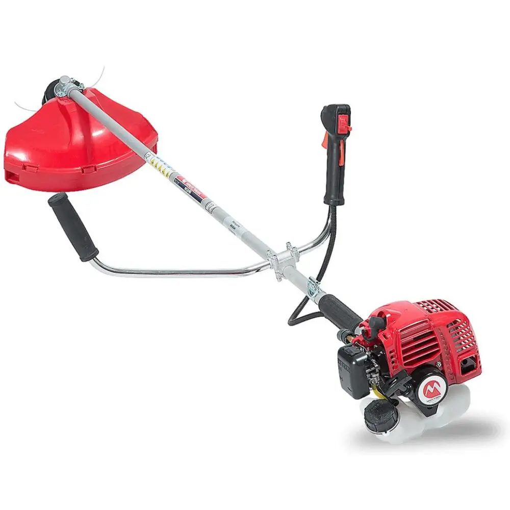 A mighty petrol brush cutter with a double handle design and a line-feed to ensure a closer cut around the edges of the lawn, the brush blade makes it easier to tackle thick and overgrown vegetation.