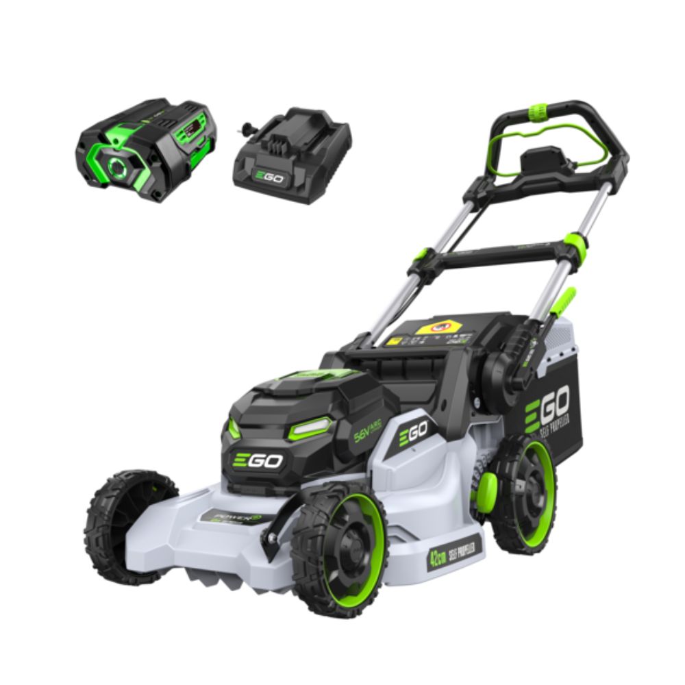 Experience power and control with the EGO 42cm Self-Propelled Lawn Mower, featuring a brushless motor, LED dashboard, variable speeds, and large 55L collection bag for flawless, quiet mowing across any garden terrain.