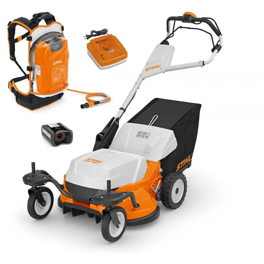 A professional cordless lawnmower with a 63 cm cutter deck and exceptional manoeuvrability. Includes backpack battery, charger, and connecting accessories.