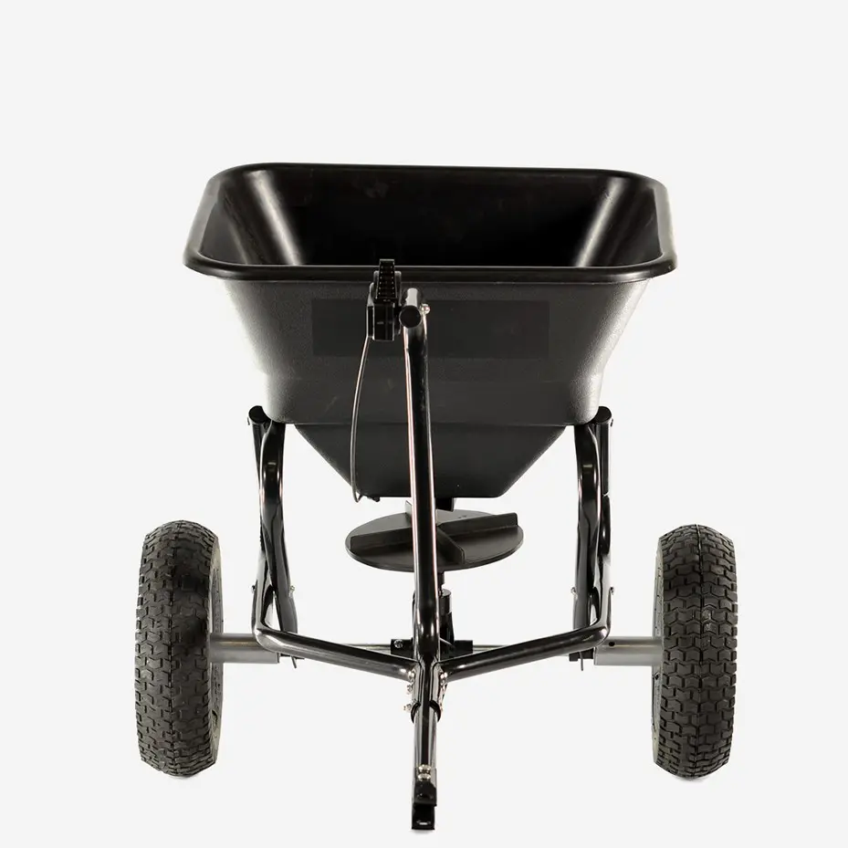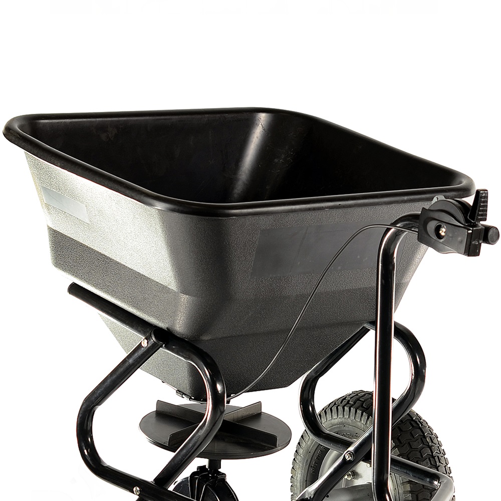 It has a 45 Litre poly hopper that is corrosion resistant, and can spread an array of dry material including lawn feed, seed, and ice-melt, with a spread width of 8-10 feet. The rate of spread can be easily set to suit the application.