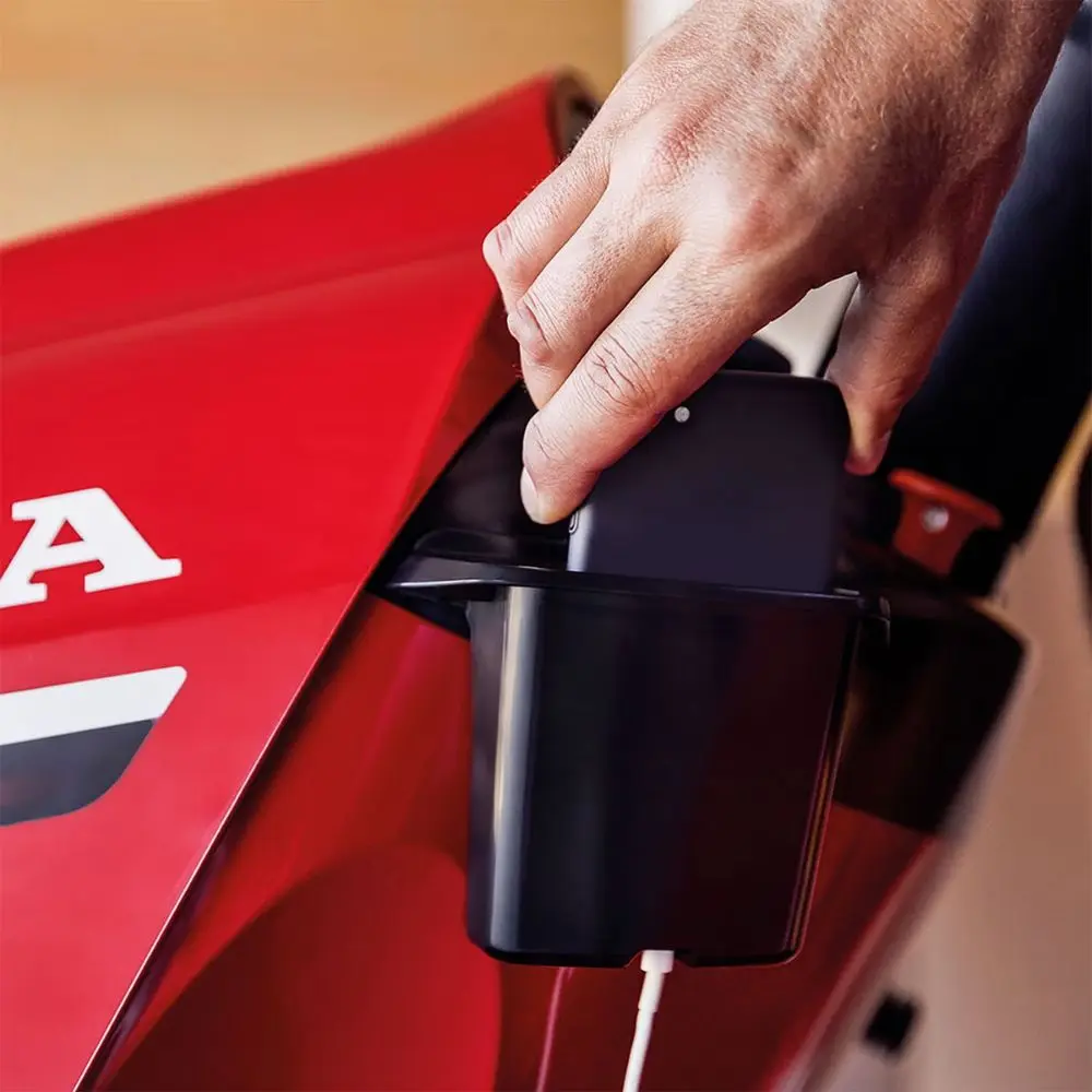It comes with a USB port and storage pocket too, so you can charge and safely house your mobile devices while you mow.
