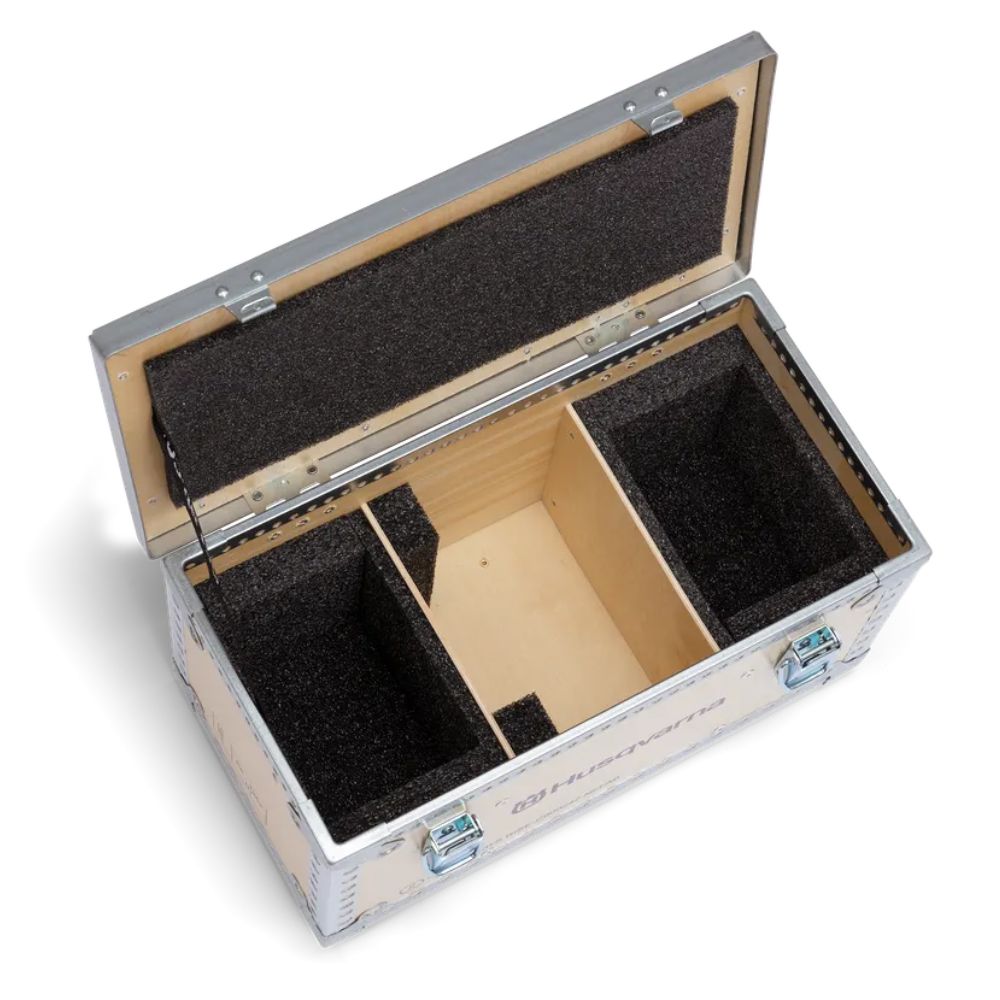 This durable Husqvarna battery transport box safely stores two BLi-X 36V batteries and a charger. Featuring a strong wooden build, metal clasps, large carry handle, and cushioned inserts, it offers safe, convenient and organised battery transport for professionals.