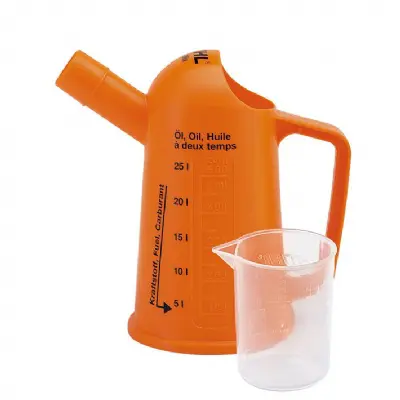 The STIHL plastic measuring jug is used for preparing 2-stroke fuel mixes, with a choice between a 5 litre capacity or a 25 litre capacity. Image shows both the 5 litre and 25 litre jugs together, but they are sold separately.