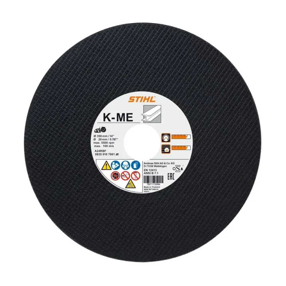 Tackle tough steel with the STIHL KM-E Abrasive Cutting Wheel. Built from a durable composite resin, it delivers excellent performance on structural steel, rebar, stainless steel and girders. Available in multiple sizes to fit STIHL cut-off machines, this wheel ensures lasting reliability for professional cutting tasks.