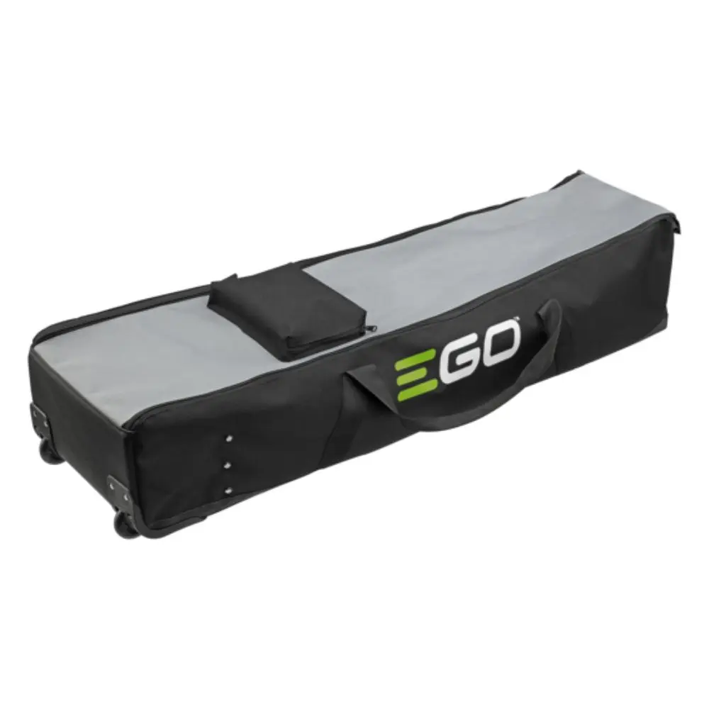 Heavy-duty wheeled bag for transporting and storing EGO multi-tool systems. Features elastic tool straps, battery compartment, rugged wheels, and weather-resistant fabric.