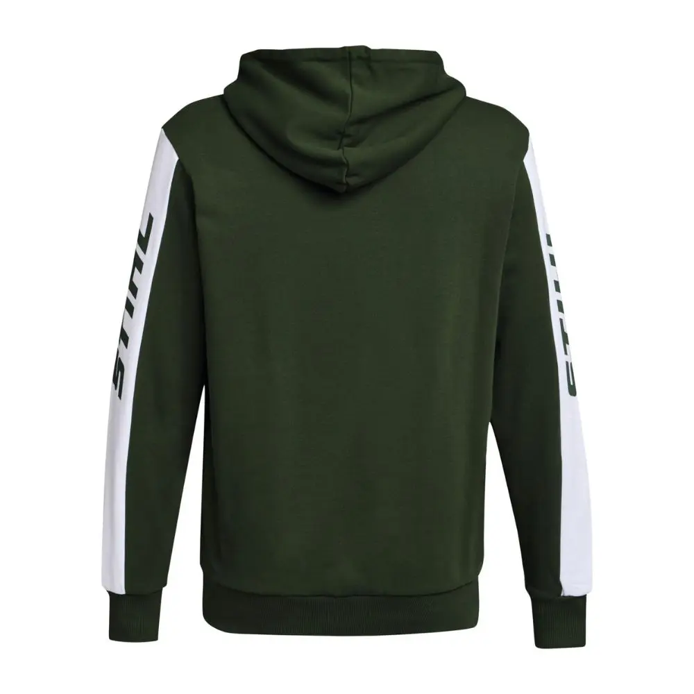 The design of the hoody boldly diverges from the classic STIHL palette of black, orange, and grey, venturing into a more vivid and playful aesthetic. The striking green and white combination not only ensures you stand out in any setting, be it while engaged in work, tending to the garden, or navigating the urban landscape, but also serves as a dynamic expression of individuality. Embellished with the prominent STIHL logo on both the chest and arms, the hoody transcends mere functionality to become a powerful statement piece. The inclusion of these logos adds a retro vibe to the garment, creating a perfect harmony between contemporary fashion sensibilities and a respectful nod to STIHL’s heritage.