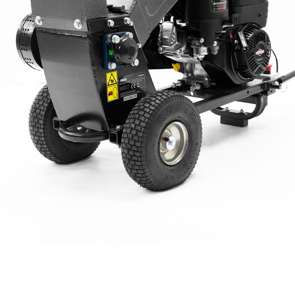 This Handy wood shredder features a self-feed mechanism that draws material into the blades, freeing you to prepare your next load and boosting overall productivity. Wide pneumatic tyres ensure the machine stays stable during operation, while ball-bearing-mounted wheels make moving the unit between worksites easy—even on rough or uneven ground.